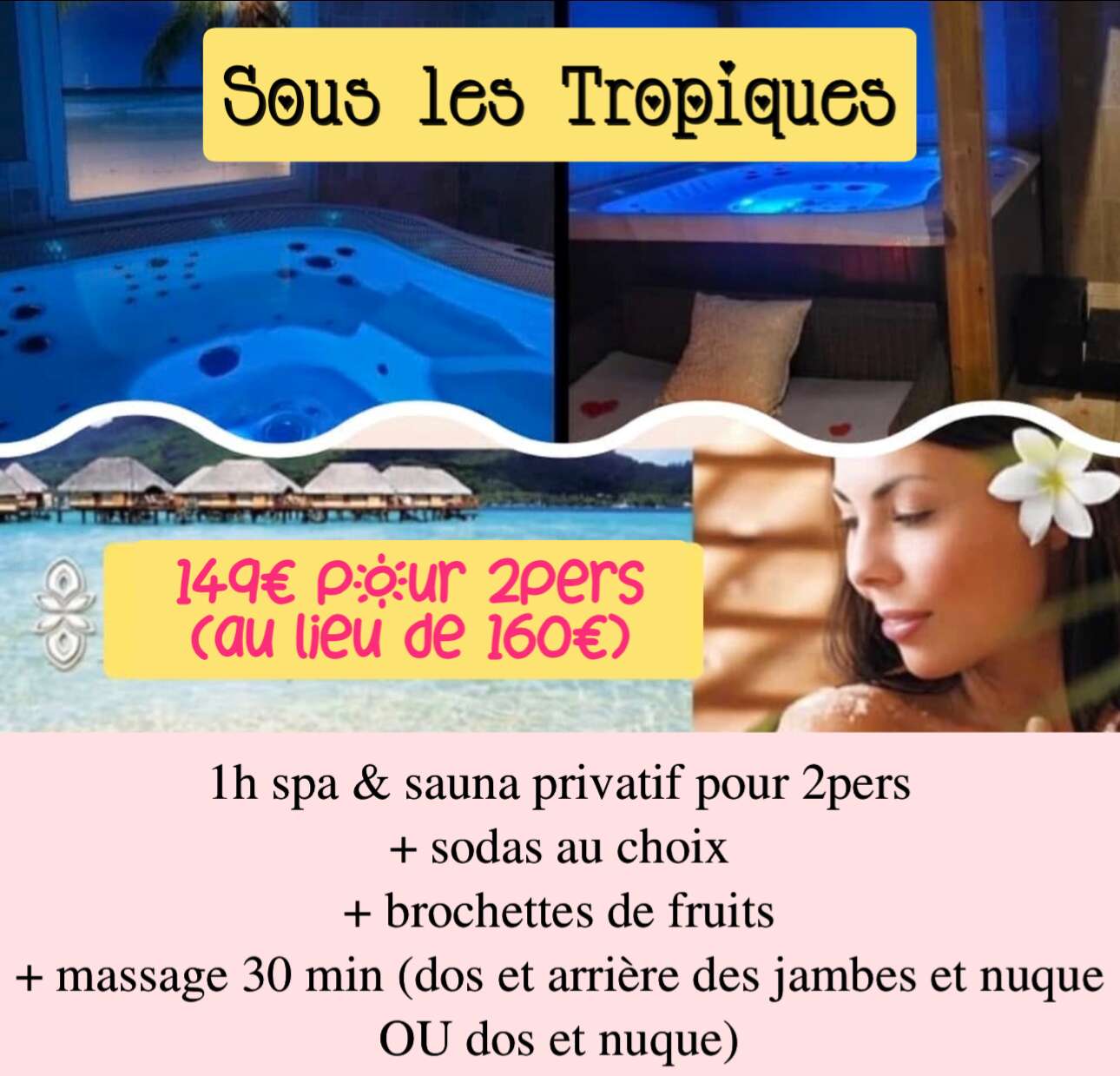 Accès 1h à l'espace privatif (spa & sauna) pour 2pers + brochettes de fruits + sodas au choix + massage 30min (arrière des jambes, dos et nuque OU dos plus long et nuque) en duo.
